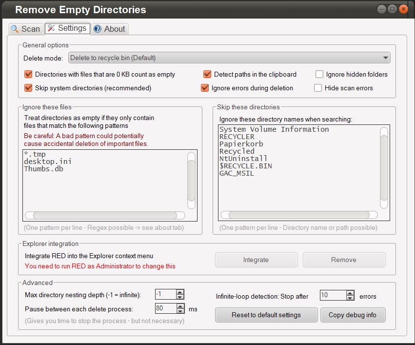 Remove Empty Directories or RED for short, is a program that can search your hard drive for folders that are empty and remove them. This can have a big impact on your disk space. The first time I ran this little gem I saved almost a full Gig of space! (Yes, that is a lot! See this post to see a breakdown)